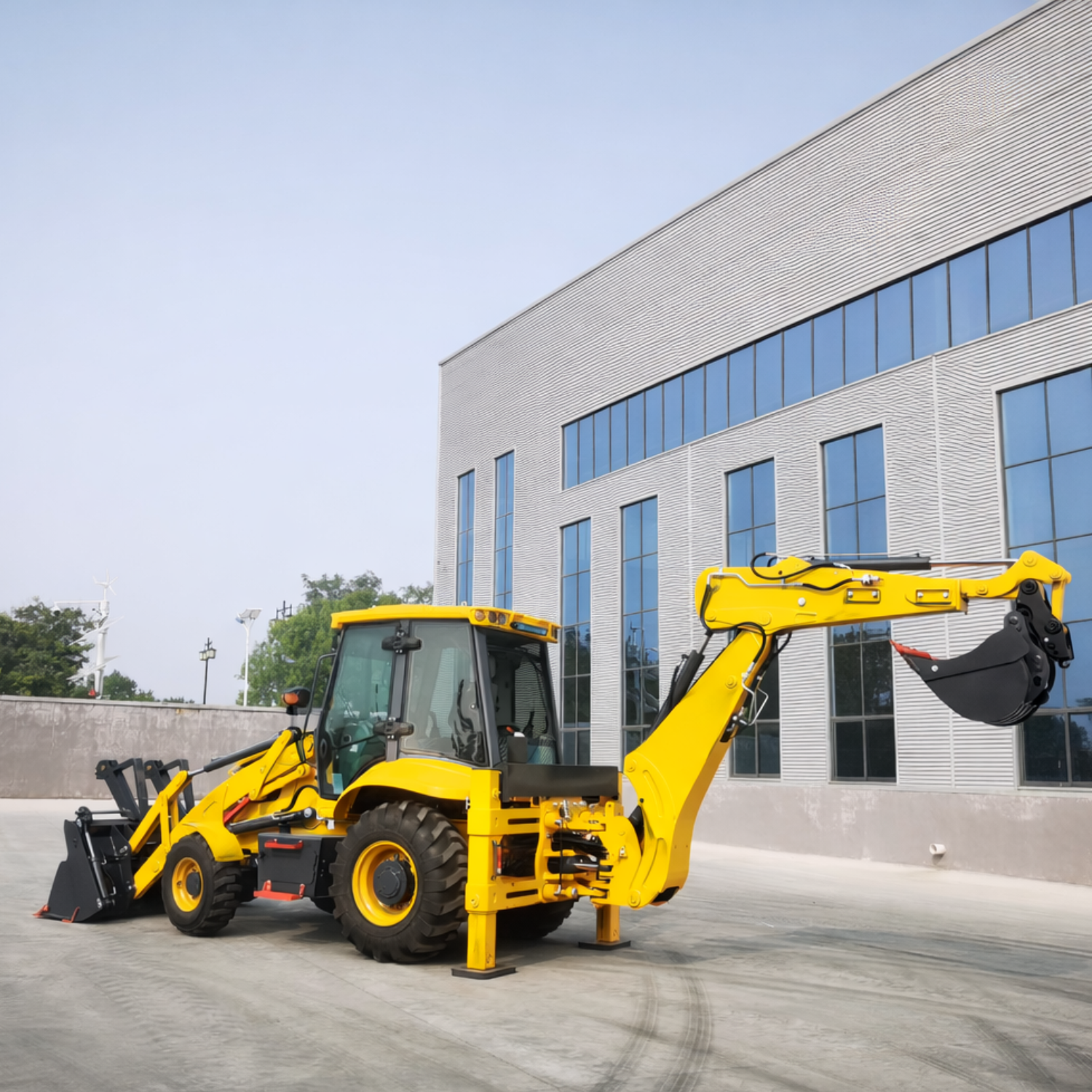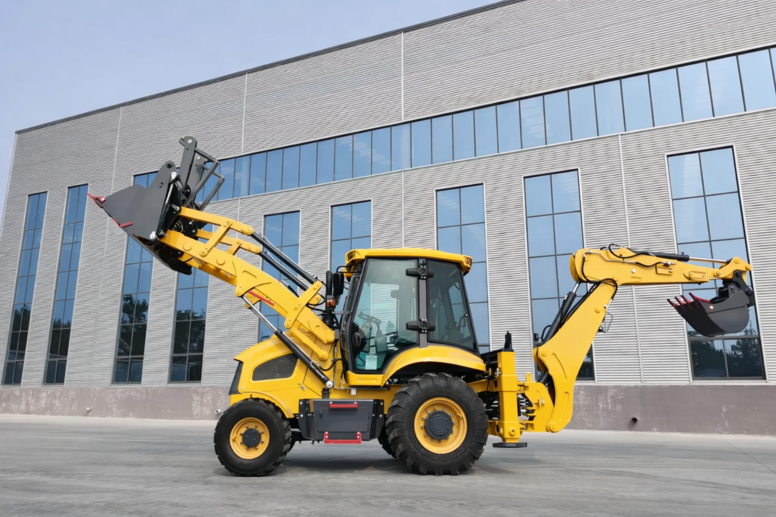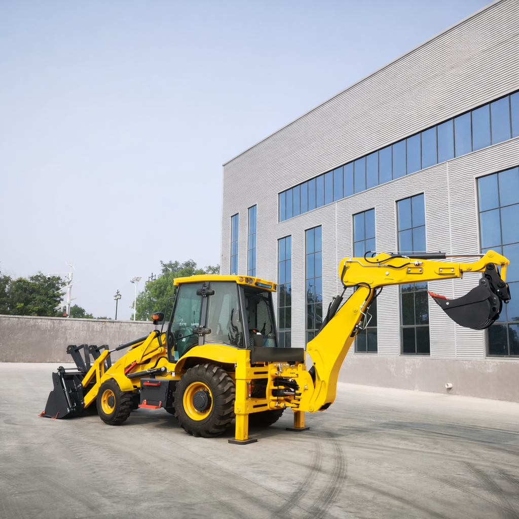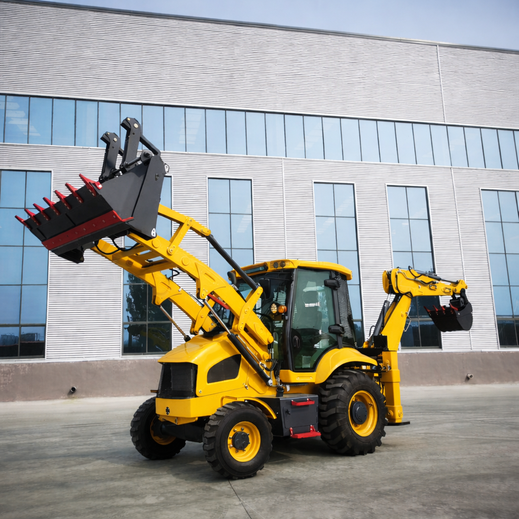 Dzięki kompaktowym wymiarom – 5934 mm długości, 2220 mm szerokości oraz 2950 mm wysokości – maszyna sprawnie manewruje nawet w ograniczonych przestrzeniach. Rozstaw osi wynosi 2285 mm. Kąt obrotu łyżki 200° oraz kąt obrotu ramienia koparkowego 190° zapewniają szeroki zakres operacyjny. Standardowe wyposażenie obejmuje również łyżkę wielofunkcyjną 6 w 1, znacząco zwiększającą uniwersalność maszyny.