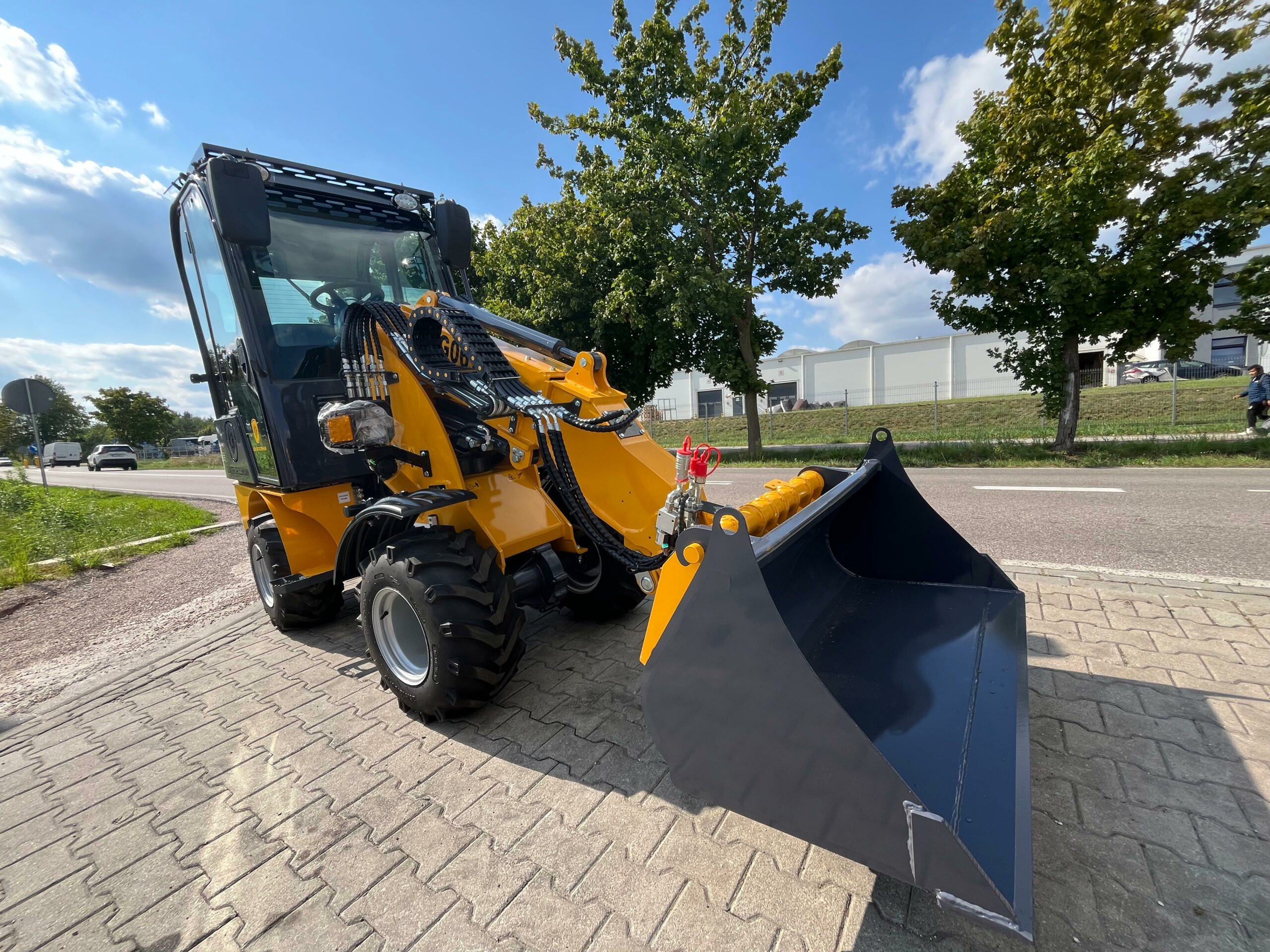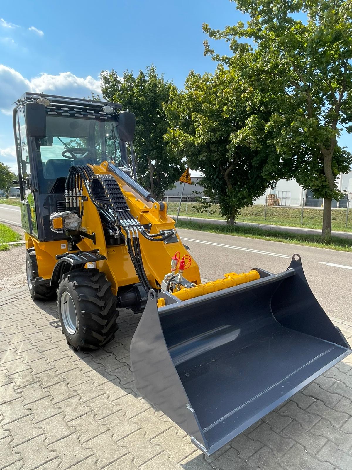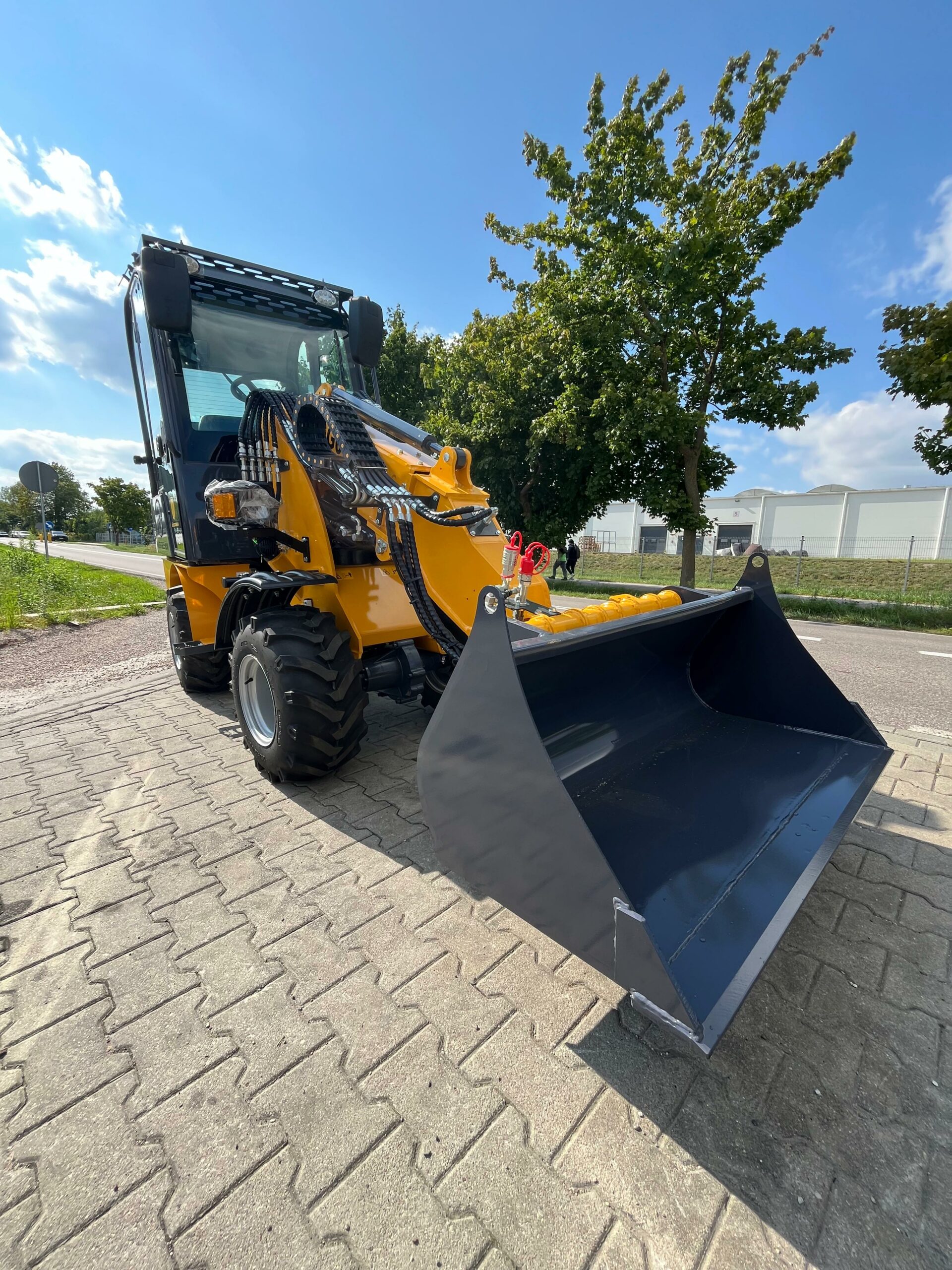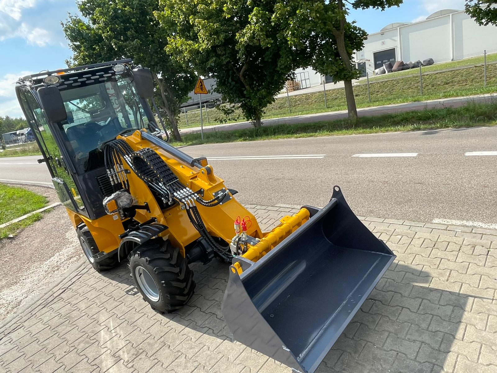 Ładowarka teleskopowa wyposażona jest w łyżkę o pojemności 0,4 m³, co pozwala na szybki i precyzyjny załadunek materiałów. Z ładownością 600 kg maszyna zachowuje stabilność i efektywność, nawet przy transportowaniu cięższych ładunków.