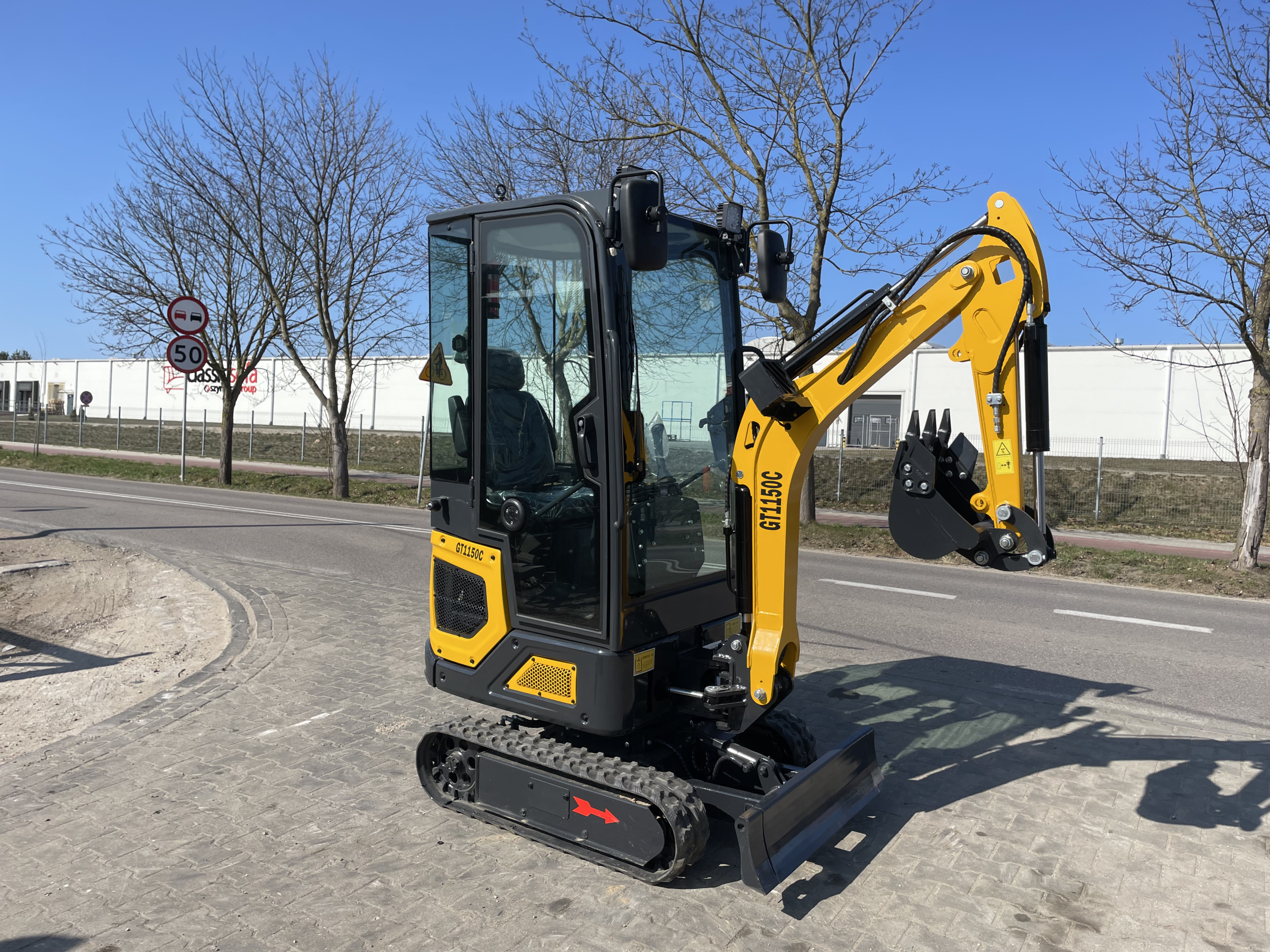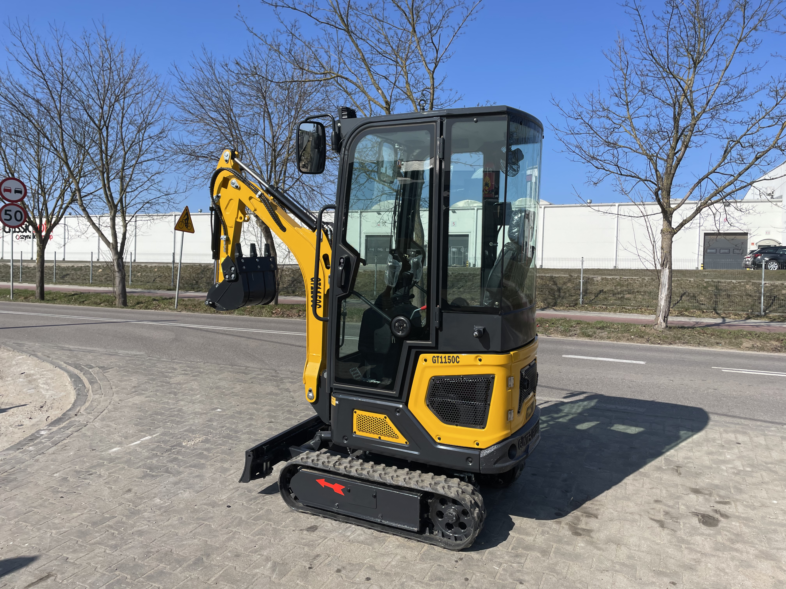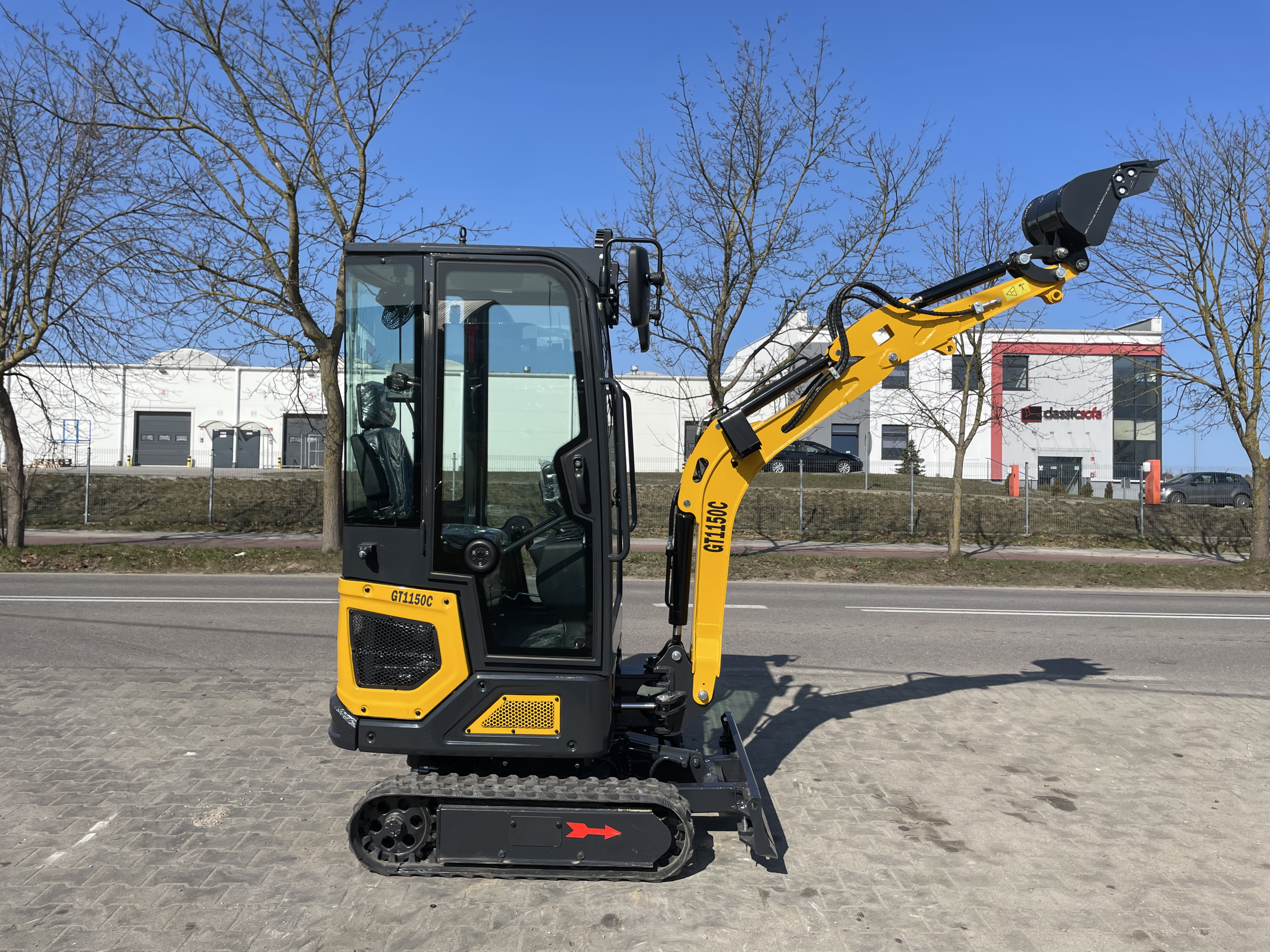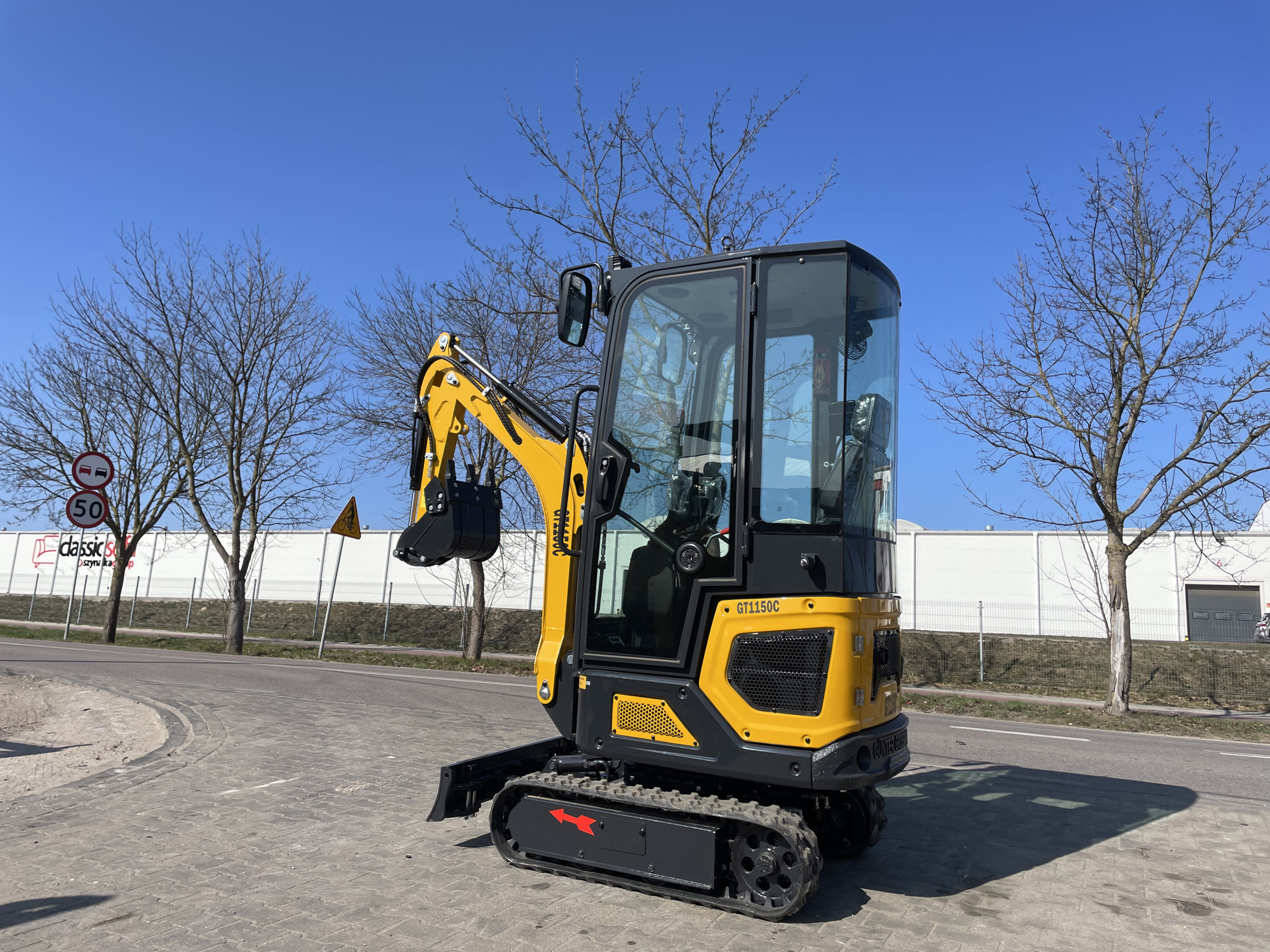GT1150C została wyposażona w ergonomiczne sterowanie rozsuwane gąsienice, co umożliwia płynną i precyzyjną obsługę wszystkich funkcji roboczych. Skrętne ramię znacząco ułatwia wykonywanie wykopów przy ścianach, ogrodzeniach oraz w trudno dostępnych miejscach, zwiększając funkcjonalność maszyny.