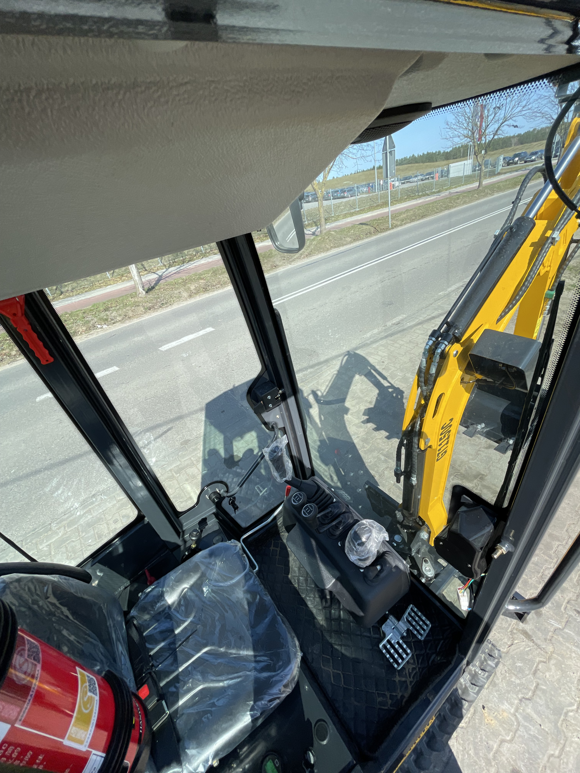 Standardowa pojemność łyżki wynosi 0,02 m³, co pozwala na sprawne wykonywanie typowych prac ziemnych. Maksymalna głębokość kopania to 1680 mm, a maksymalny promień kopania przy gruncie wynosi 2430 mm. Maszyna osiąga maksymalną wysokość kopania 2490 mm oraz wysokość wysypu 1760 mm. Minimalny promień obrotu wynosi 1190 mm, co umożliwia efektywną pracę w ograniczonej przestrzeni.
