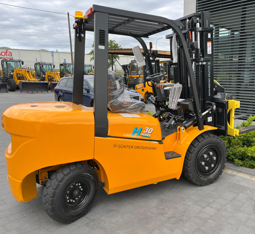 Parametry udźwigu sięgające 3000 kg oraz maksymalna wysokość podnoszenia wynosząca 4,5 m sprawiają, że ten wózek jest idealnym rozwiązaniem do przenoszenia i układania ciężkich ładunków na dużych wysokościach. Maszt typu triplex nie tylko potrafi wytrzymać duże obciążenia, ale także zapewnia płynny i stabilny ruch wideł, co znacznie ułatwia pracę. Zintegrowany przesuw boczny wideł oraz pneumatyczne opony gwarantują elastyczność i precyzję w manewrowaniu, co jest szczególnie ważne w ciasnych przestrzeniach.