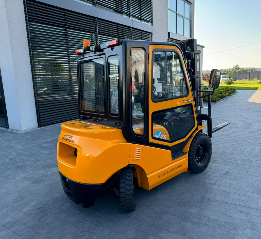 Wózek ten wyposażony jest w maszt typu triplex, co pozwala na podnoszenie ładunków na wysokość do 4.5 metrów. Wózek J25 mierzy 2595 mm długości, 1160 mm szerokości i 1995 mm wysokości w konfiguracji z obniżonym masztem. Przy maksymalnym podniesieniu, wysokość masztu osiąga 4015 mm, co pozwala na efektywne składowanie w pionie. Promień skrętu wynoszący 2300 mm sprawia, że maszyna doskonale sprawdza się w ciasnych miejscach.